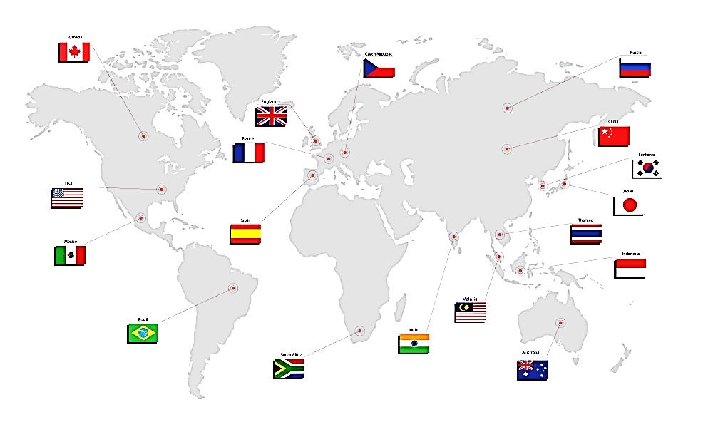 USA, Czech Republic, Korea, Japan, China, Thailand, India, Mexico.